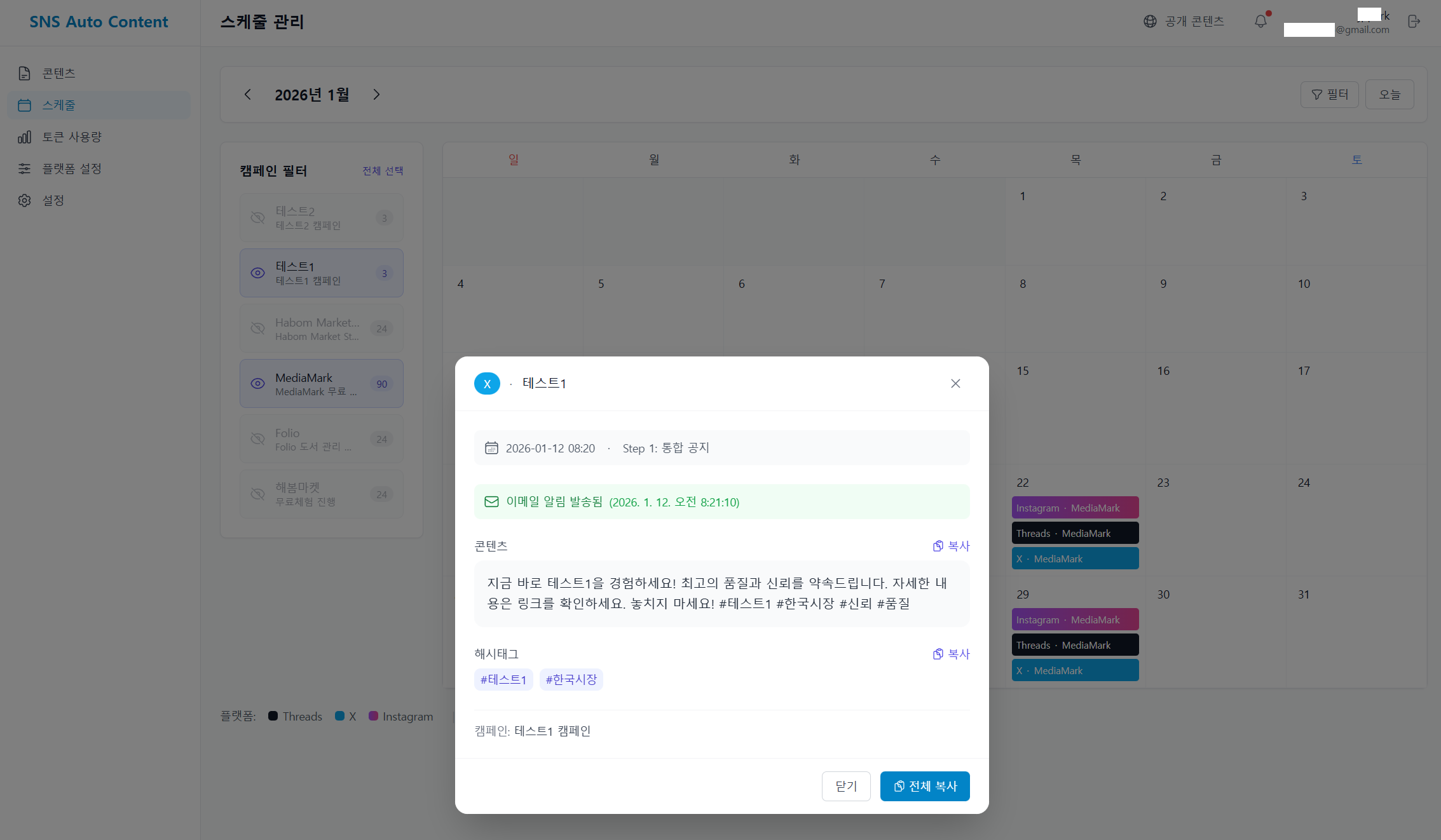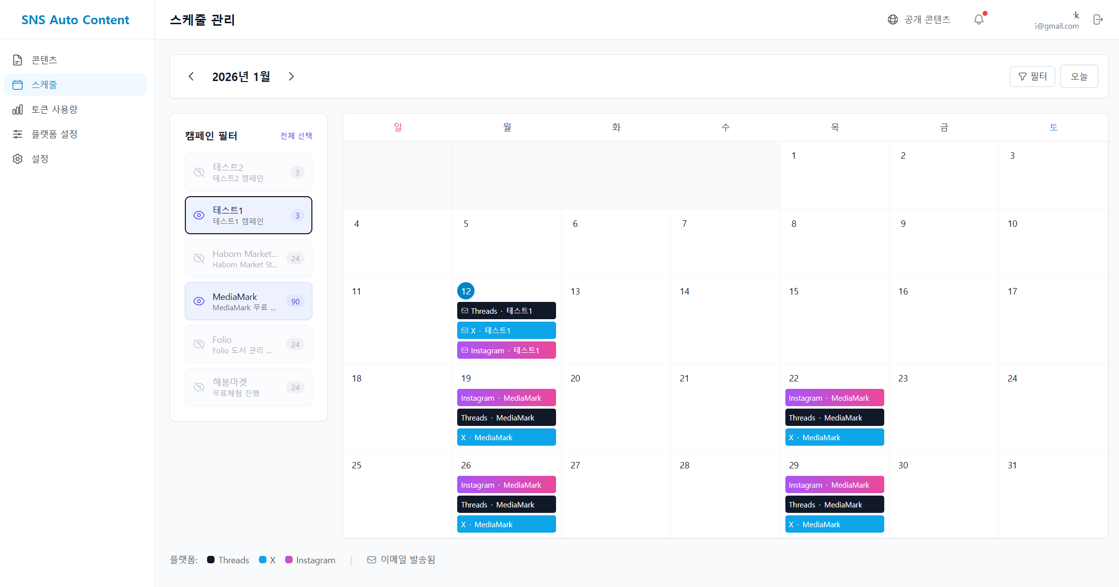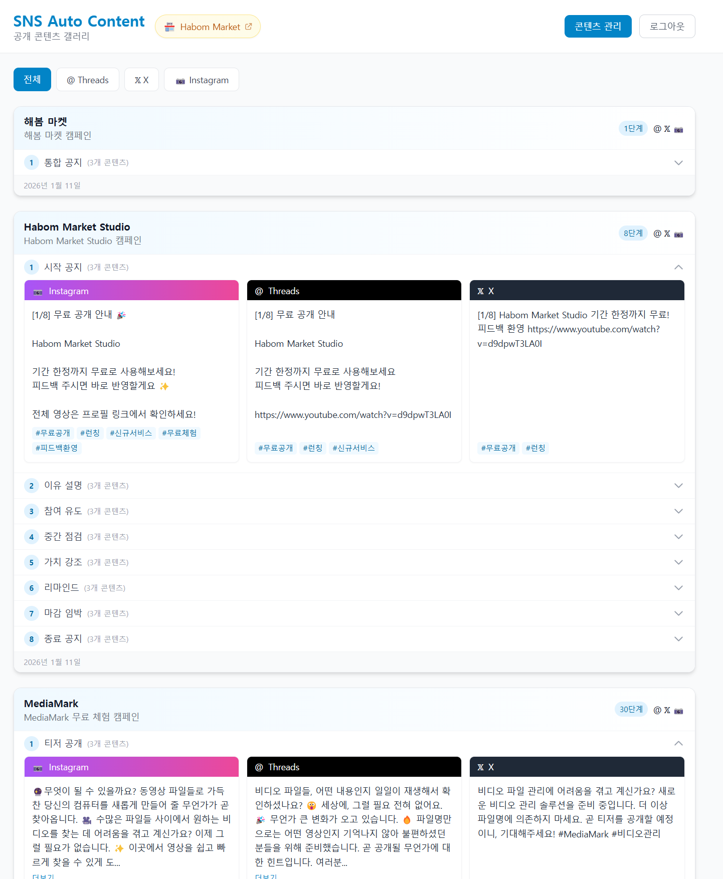 이 서비스는 Instagram, Threads, X(SNS) 업로드용 콘텐츠를 AI로 자동 생성하고, 일정에 맞춰 관리할 수 있도록 도와주는 콘텐츠 작성 & 관리 도구입니다.