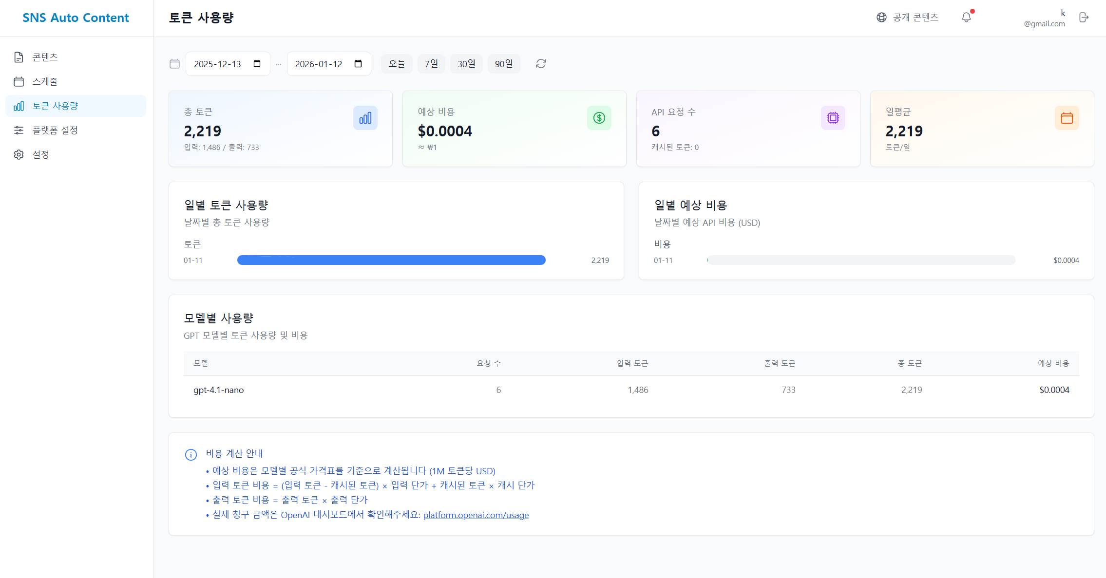 • 토큰 사용량 확인 가능 ⚠️ 계산값은 참고용 OpenAI 공식 usage 페이지 링크 제공
