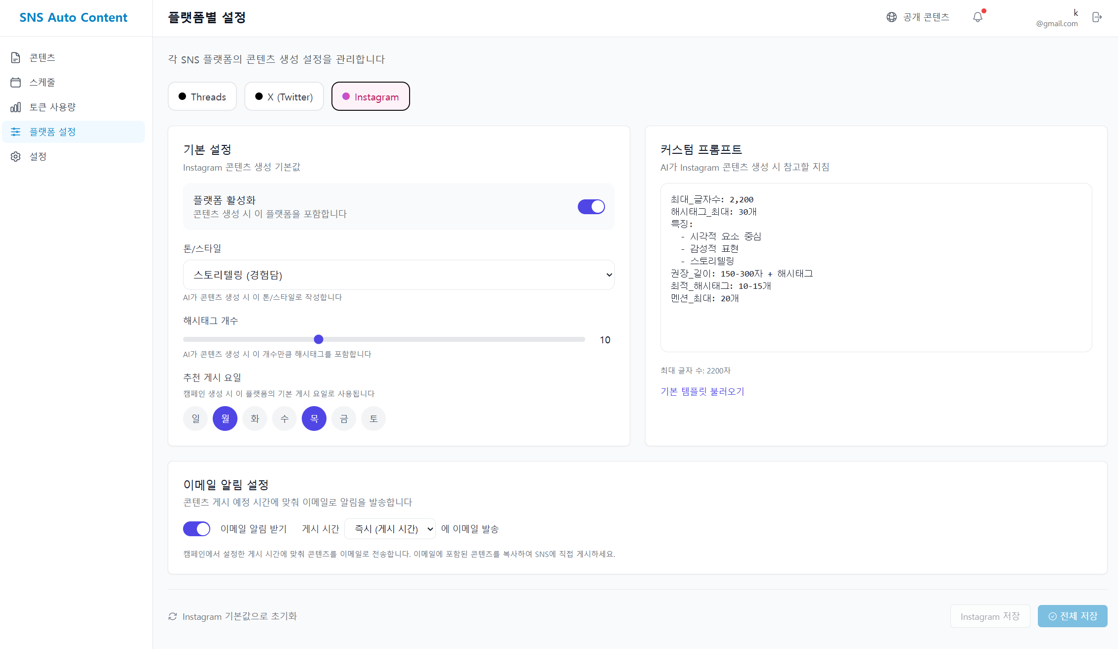 플랫폼 설정에서는 각 SNS 별로 프롬프트 설정을 할 수 있습니다. 그리고 콘텐츠 생성시 언제 업로드를 할지 템플릿형태로 설정할 수 있습니다.